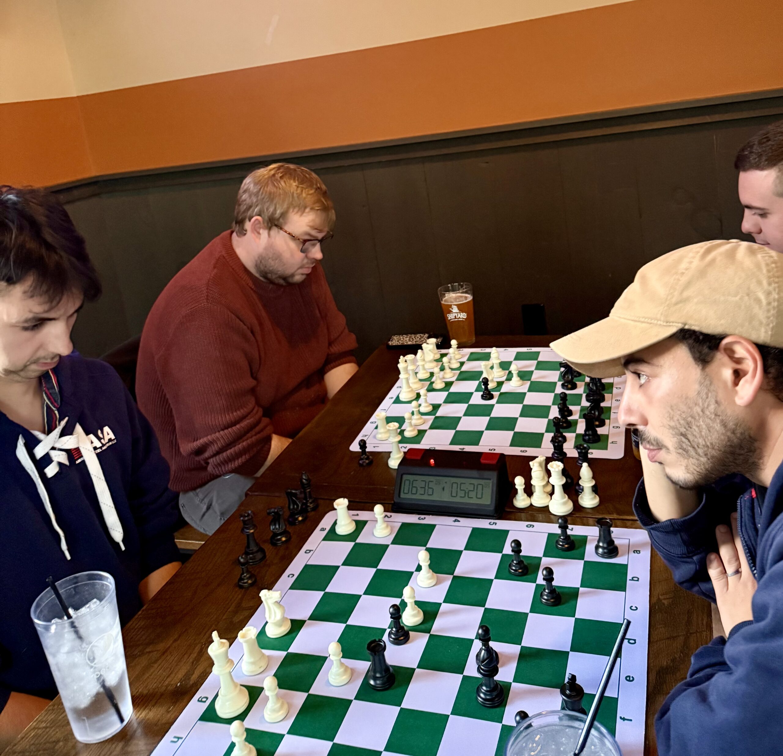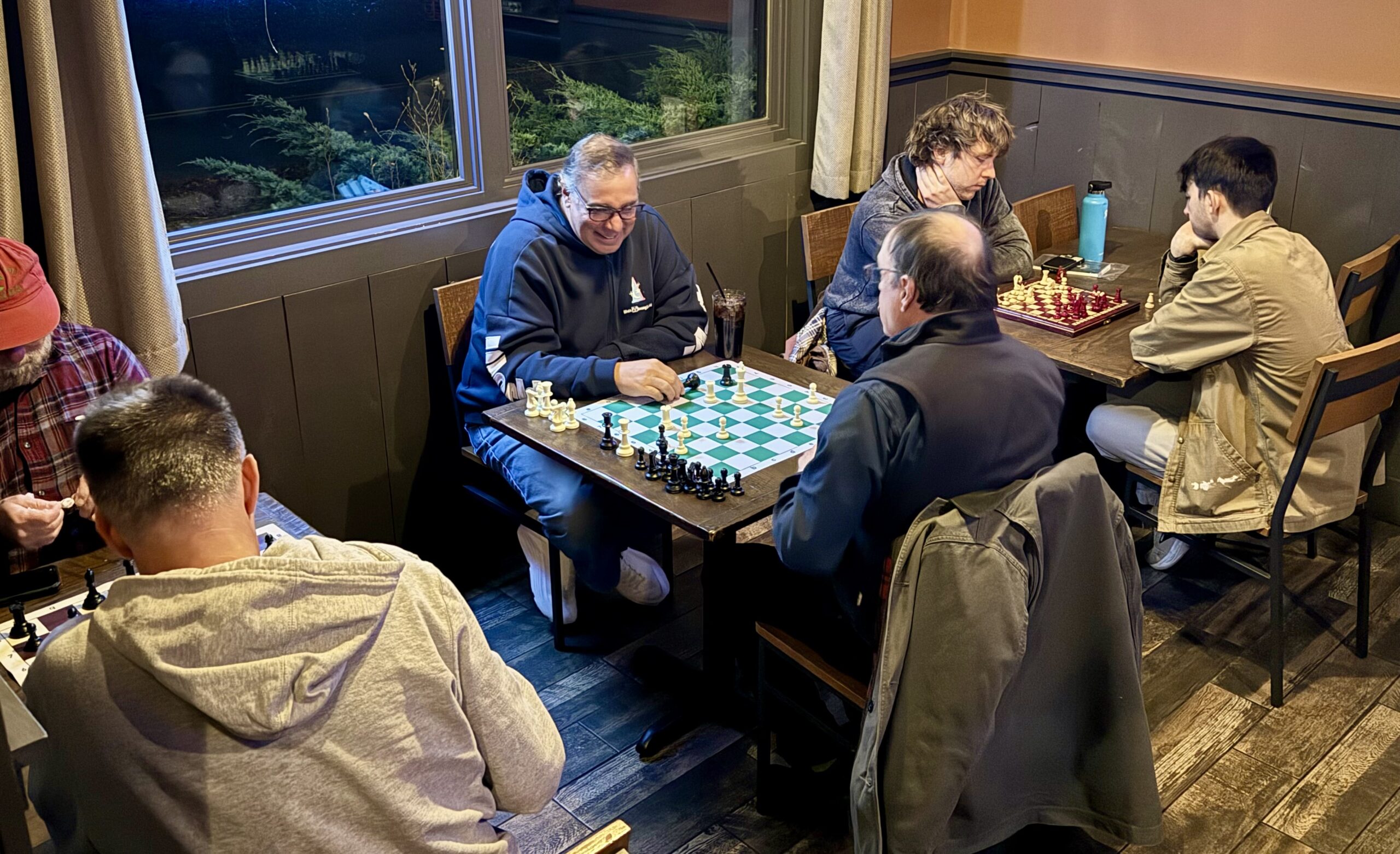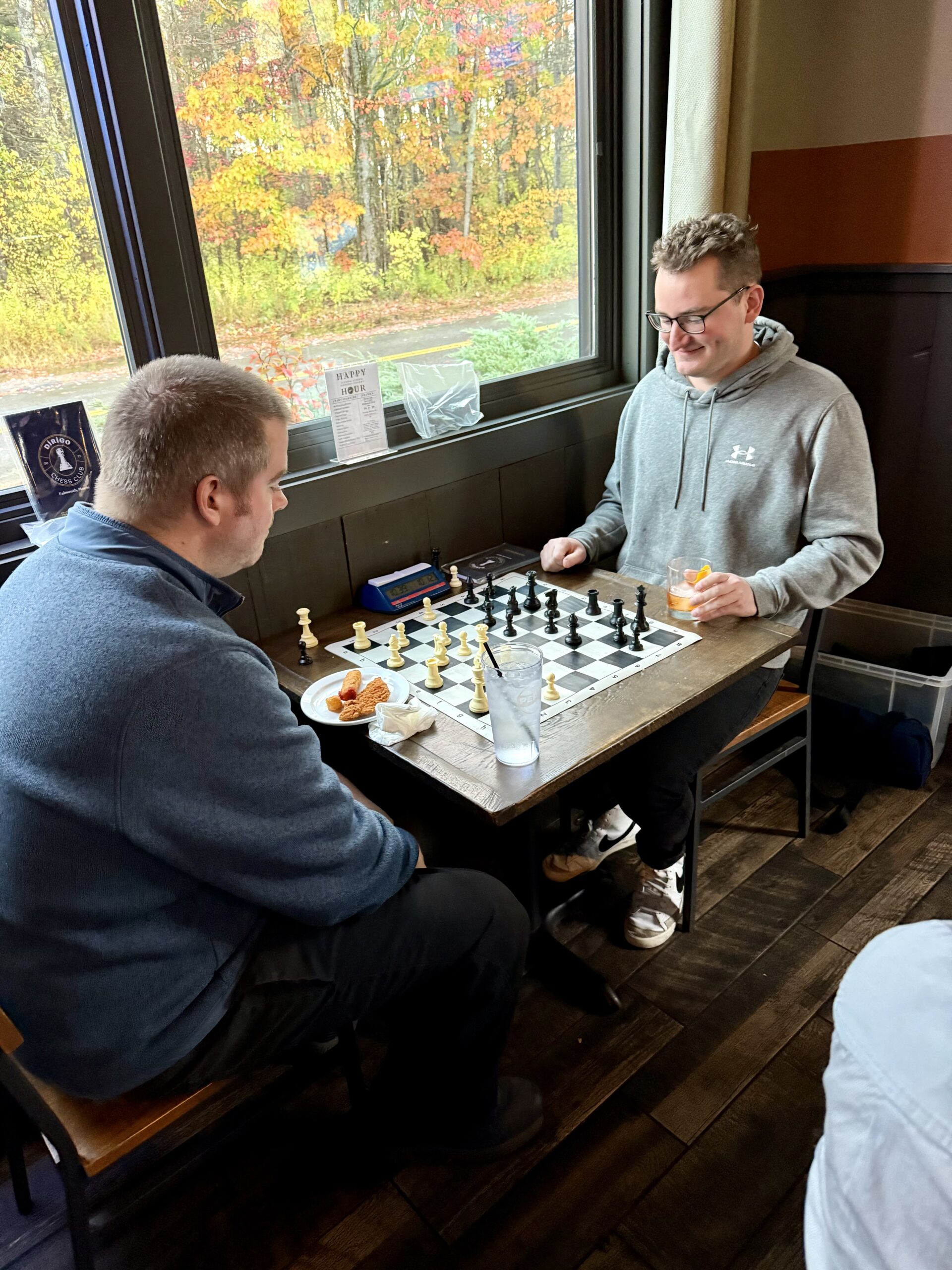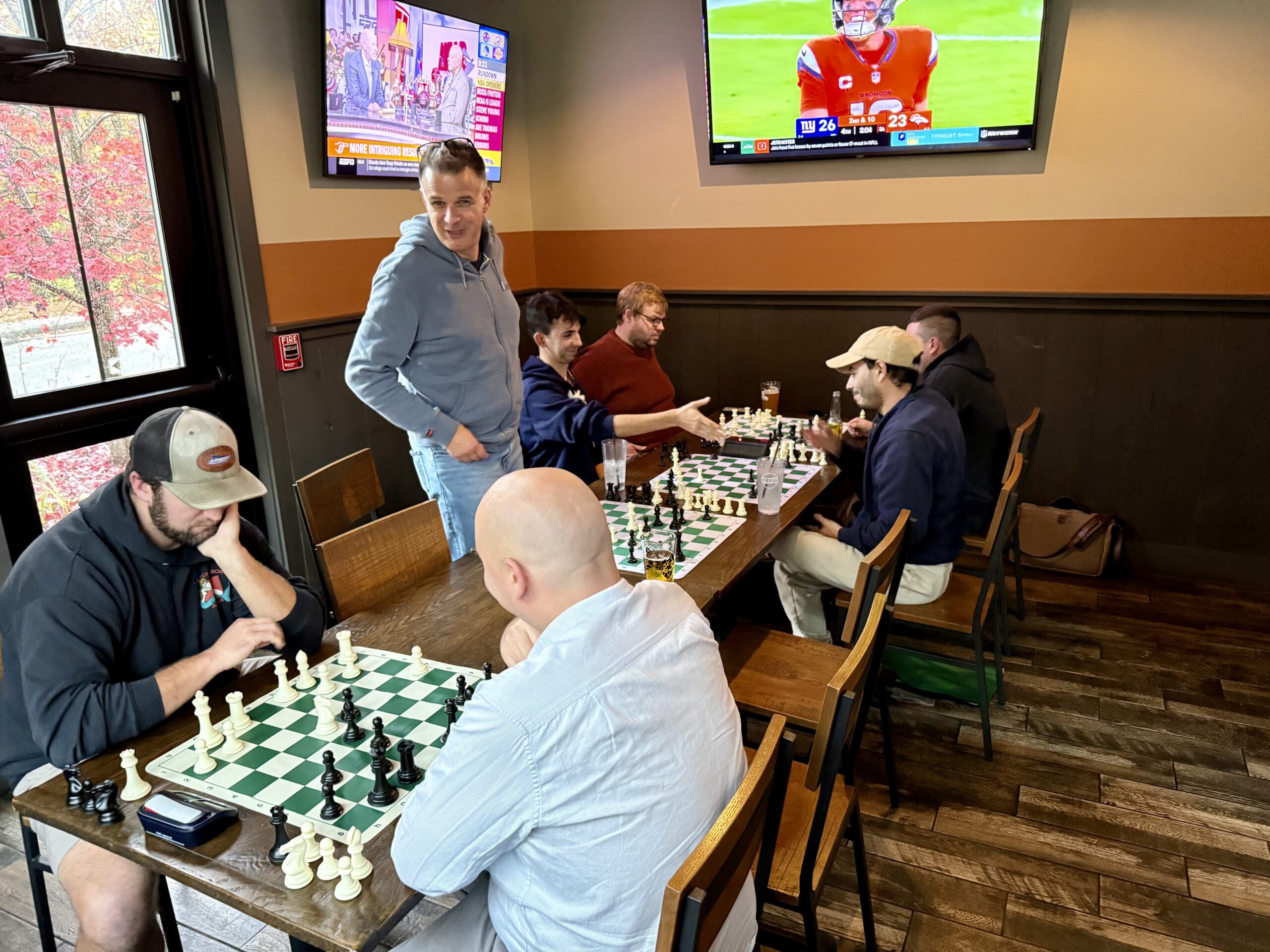 (October, 2025) Our most recent meetup at Rivalries in Falmouth had a packed house! We literally had to bring in some additional tables to fit all of the games taking place in the “Mafia Room.” Players of all levels competed — for fun — and everyone learned. Regardless of age, players enjoyed the “light” atmosphere, with no judgment and lots of camaraderie. Many of the guests in October were brand new to the club, and told us how terrific their time was that evening. We love hearing that! Bring your friends and spread the word — and bring a chess set to use if you can, as we have limited sets to borrow.
